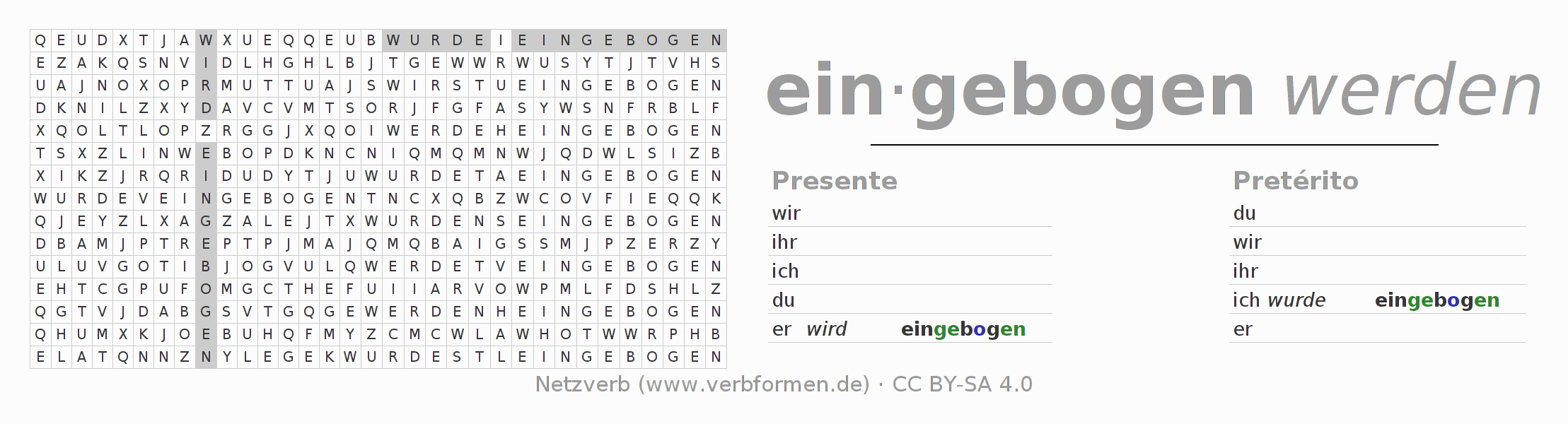Las hojas de trabajo te ayudan para practicar con la conjugación de los verbos einbiegen en la escuela o de forma autodidacta. El material de estudio es Open Educational Resources (OER), es decir, libre de licencias CC BY-SA 4.0 y pude ser descargado y utilizado de forma gratuita, por ejemplo para la escuela. Con este fin tenemos para ti varios tipos de hojas de trabajo para los verbos einbiegen (hat) en forma de tablas de conjugación, acertijos y juegos. Todo el material esta disponible de forma gratuita para descargas PDF, imágenes y paginas web interactivas. Junto con los ejercicios hay innumerables ejemplos einbiegen que te ayudan en el uso de los verbos.