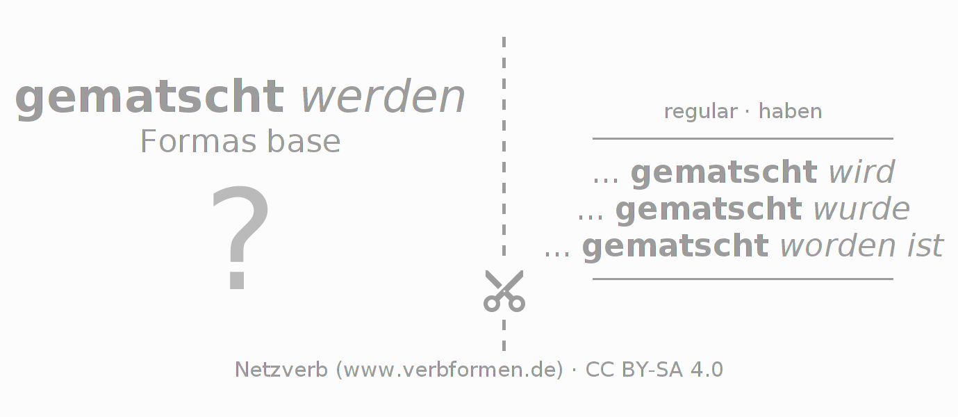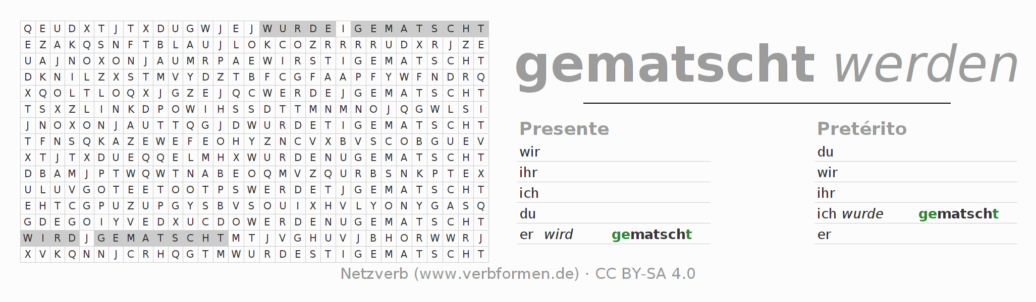 Las hojas de trabajo te ayudan para practicar con la conjugación de los verbos matschen en la escuela o de forma autodidacta. El material de estudio es Open Educational Resources (OER), es decir, libre de licencias CC BY-SA 4.0 y pude ser descargado y utilizado de forma gratuita, por ejemplo para la escuela. Con este fin tenemos para ti varios tipos de hojas de trabajo para los verbos matschen en forma de tablas de conjugación, acertijos y juegos. Todo el material esta disponible de forma gratuita para descargas PDF, imágenes y paginas web interactivas. Junto con los ejercicios hay innumerables ejemplos matschen que te ayudan en el uso de los verbos.