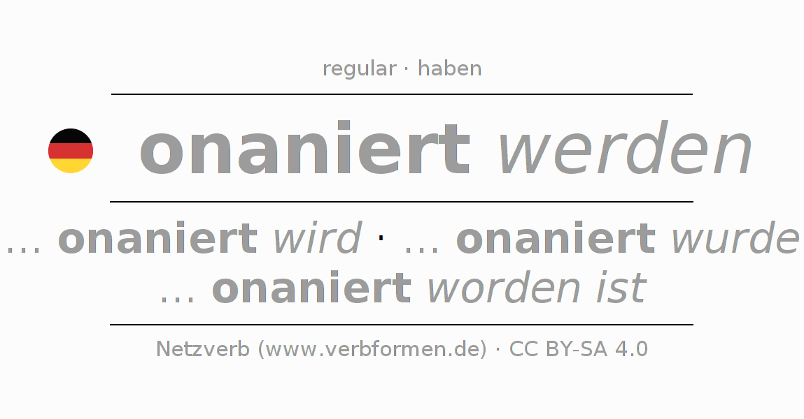 Las hojas de trabajo te ayudan para practicar con la conjugación de los verbos onanieren en la escuela o de forma autodidacta. El material de estudio es Open Educational Resources (OER), es decir, libre de licencias CC BY-SA 4.0 y pude ser descargado y utilizado de forma gratuita, por ejemplo para la escuela. Con este fin tenemos para ti varios tipos de hojas de trabajo para los verbos onanieren en forma de tablas de conjugación, acertijos y juegos. Todo el material esta disponible de forma gratuita para descargas PDF, imágenes y paginas web interactivas. Junto con los ejercicios hay innumerables ejemplos onanieren que te ayudan en el uso de los verbos.