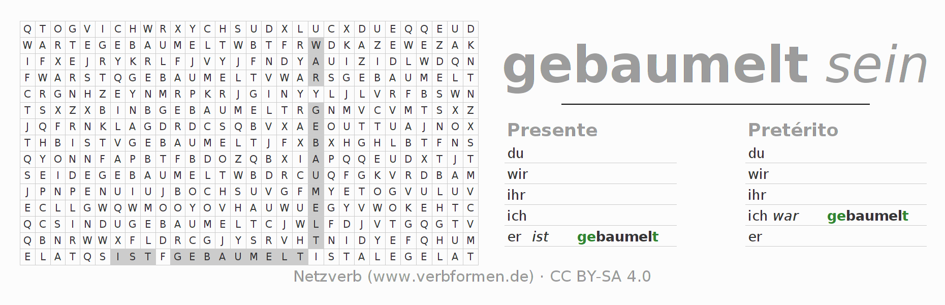 Las hojas de trabajo te ayudan para practicar con la conjugación de los verbos baumeln en la escuela o de forma autodidacta. El material de estudio es Open Educational Resources (OER), es decir, libre de licencias CC BY-SA 4.0 y pude ser descargado y utilizado de forma gratuita, por ejemplo para la escuela. Con este fin tenemos para ti varios tipos de hojas de trabajo para los verbos baumeln en forma de tablas de conjugación, acertijos y juegos. Todo el material esta disponible de forma gratuita para descargas PDF, imágenes y paginas web interactivas. Junto con los ejercicios hay innumerables ejemplos baumeln que te ayudan en el uso de los verbos.