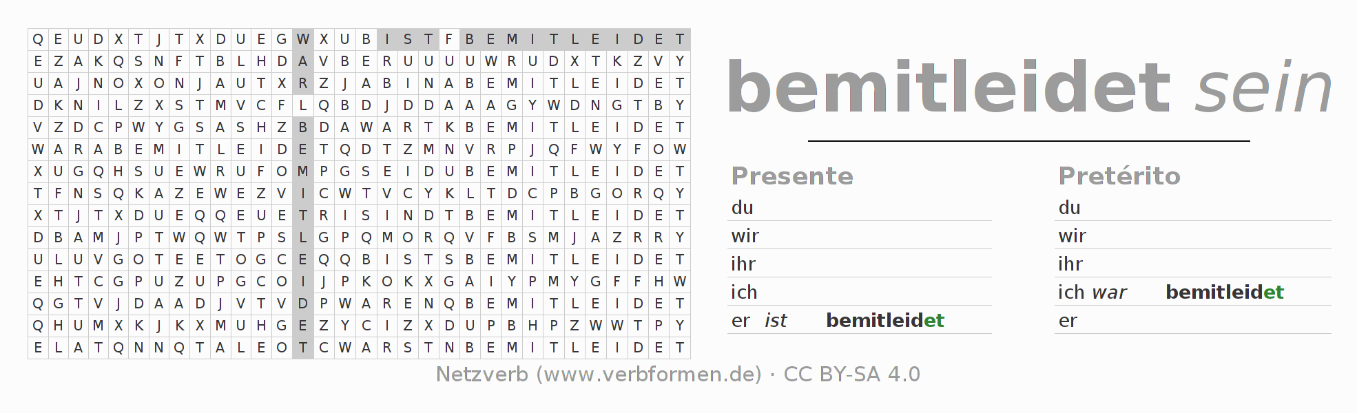 Las hojas de trabajo te ayudan para practicar con la conjugación de los verbos bemitleiden en la escuela o de forma autodidacta. El material de estudio es Open Educational Resources (OER), es decir, libre de licencias CC BY-SA 4.0 y pude ser descargado y utilizado de forma gratuita, por ejemplo para la escuela. Con este fin tenemos para ti varios tipos de hojas de trabajo para los verbos bemitleiden en forma de tablas de conjugación, acertijos y juegos. Todo el material esta disponible de forma gratuita para descargas PDF, imágenes y paginas web interactivas. Junto con los ejercicios hay innumerables ejemplos bemitleiden que te ayudan en el uso de los verbos.
