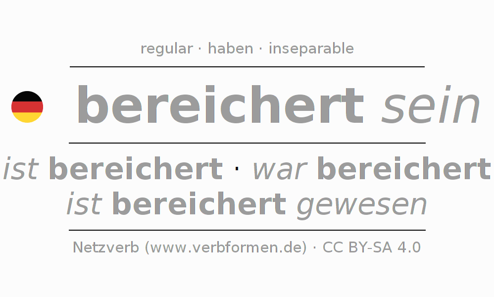 Las hojas de trabajo te ayudan para practicar con la conjugación de los verbos bereichern en la escuela o de forma autodidacta. El material de estudio es Open Educational Resources (OER), es decir, libre de licencias CC BY-SA 4.0 y pude ser descargado y utilizado de forma gratuita, por ejemplo para la escuela. Con este fin tenemos para ti varios tipos de hojas de trabajo para los verbos bereichern en forma de tablas de conjugación, acertijos y juegos. Todo el material esta disponible de forma gratuita para descargas PDF, imágenes y paginas web interactivas. Junto con los ejercicios hay innumerables ejemplos bereichern que te ayudan en el uso de los verbos.