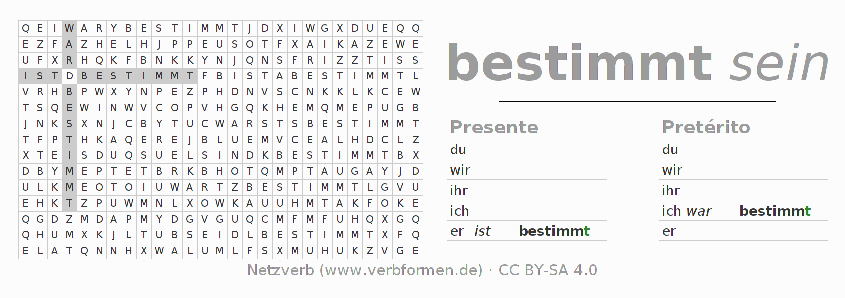 Las hojas de trabajo te ayudan para practicar con la conjugación de los verbos bestimmen en la escuela o de forma autodidacta. El material de estudio es Open Educational Resources (OER), es decir, libre de licencias CC BY-SA 4.0 y pude ser descargado y utilizado de forma gratuita, por ejemplo para la escuela. Con este fin tenemos para ti varios tipos de hojas de trabajo para los verbos bestimmen en forma de tablas de conjugación, acertijos y juegos. Todo el material esta disponible de forma gratuita para descargas PDF, imágenes y paginas web interactivas. Junto con los ejercicios hay innumerables ejemplos bestimmen que te ayudan en el uso de los verbos.