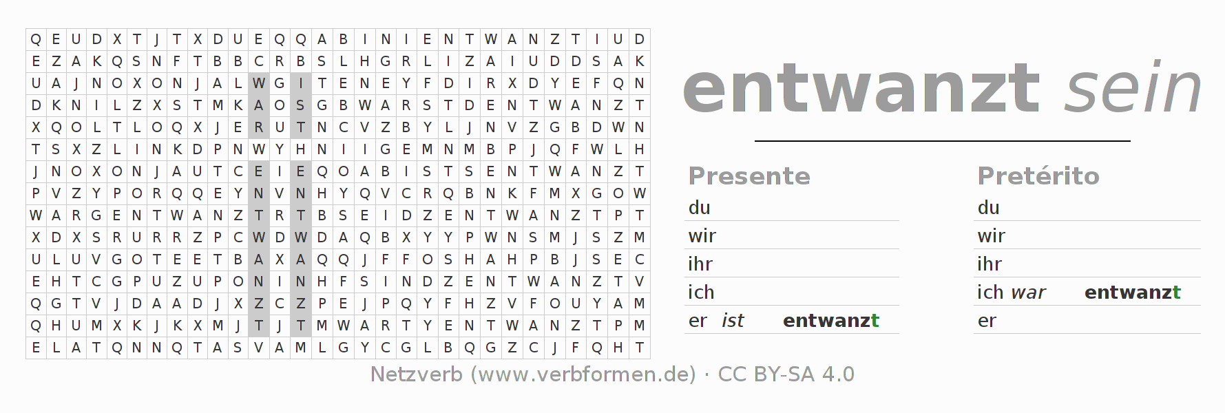 Las hojas de trabajo te ayudan para practicar con la conjugación de los verbos entwanzen en la escuela o de forma autodidacta. El material de estudio es Open Educational Resources (OER), es decir, libre de licencias CC BY-SA 4.0 y pude ser descargado y utilizado de forma gratuita, por ejemplo para la escuela. Con este fin tenemos para ti varios tipos de hojas de trabajo para los verbos entwanzen en forma de tablas de conjugación, acertijos y juegos. Todo el material esta disponible de forma gratuita para descargas PDF, imágenes y paginas web interactivas. Junto con los ejercicios hay innumerables ejemplos entwanzen que te ayudan en el uso de los verbos.