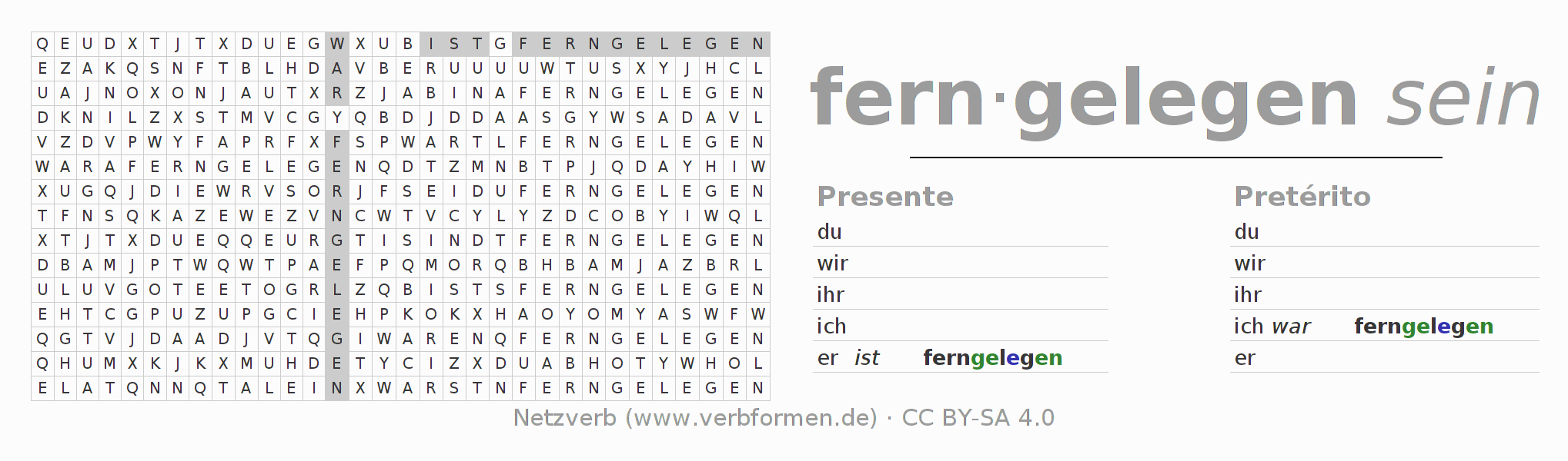 Las hojas de trabajo te ayudan para practicar con la conjugación de los verbos fernliegen en la escuela o de forma autodidacta. El material de estudio es Open Educational Resources (OER), es decir, libre de licencias CC BY-SA 4.0 y pude ser descargado y utilizado de forma gratuita, por ejemplo para la escuela. Con este fin tenemos para ti varios tipos de hojas de trabajo para los verbos fernliegen en forma de tablas de conjugación, acertijos y juegos. Todo el material esta disponible de forma gratuita para descargas PDF, imágenes y paginas web interactivas. Junto con los ejercicios hay innumerables ejemplos fernliegen que te ayudan en el uso de los verbos.