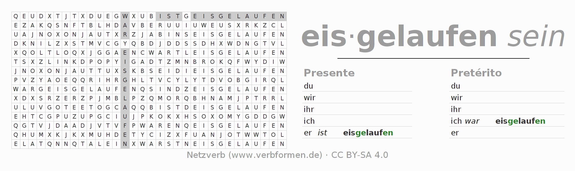 Las hojas de trabajo te ayudan para practicar con la conjugación de los verbos eislaufen en la escuela o de forma autodidacta. El material de estudio es Open Educational Resources (OER), es decir, libre de licencias CC BY-SA 4.0 y pude ser descargado y utilizado de forma gratuita, por ejemplo para la escuela. Con este fin tenemos para ti varios tipos de hojas de trabajo para los verbos eislaufen en forma de tablas de conjugación, acertijos y juegos. Todo el material esta disponible de forma gratuita para descargas PDF, imágenes y paginas web interactivas. Junto con los ejercicios hay innumerables ejemplos eislaufen que te ayudan en el uso de los verbos.