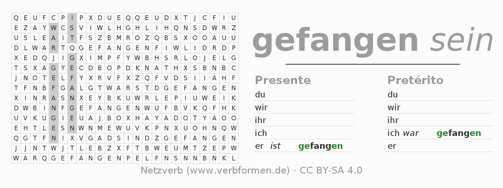 Las hojas de trabajo te ayudan para practicar con la conjugación de los verbos fangen en la escuela o de forma autodidacta. El material de estudio es Open Educational Resources (OER), es decir, libre de licencias CC BY-SA 4.0 y pude ser descargado y utilizado de forma gratuita, por ejemplo para la escuela. Con este fin tenemos para ti varios tipos de hojas de trabajo para los verbos fangen en forma de tablas de conjugación, acertijos y juegos. Todo el material esta disponible de forma gratuita para descargas PDF, imágenes y paginas web interactivas. Junto con los ejercicios hay innumerables ejemplos fangen que te ayudan en el uso de los verbos.