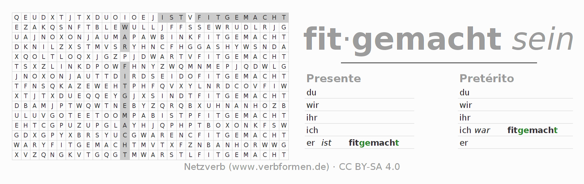 Las hojas de trabajo te ayudan para practicar con la conjugación de los verbos fitmachen en la escuela o de forma autodidacta. El material de estudio es Open Educational Resources (OER), es decir, libre de licencias CC BY-SA 4.0 y pude ser descargado y utilizado de forma gratuita, por ejemplo para la escuela. Con este fin tenemos para ti varios tipos de hojas de trabajo para los verbos fitmachen en forma de tablas de conjugación, acertijos y juegos. Todo el material esta disponible de forma gratuita para descargas PDF, imágenes y paginas web interactivas. Junto con los ejercicios hay innumerables ejemplos fitmachen que te ayudan en el uso de los verbos.