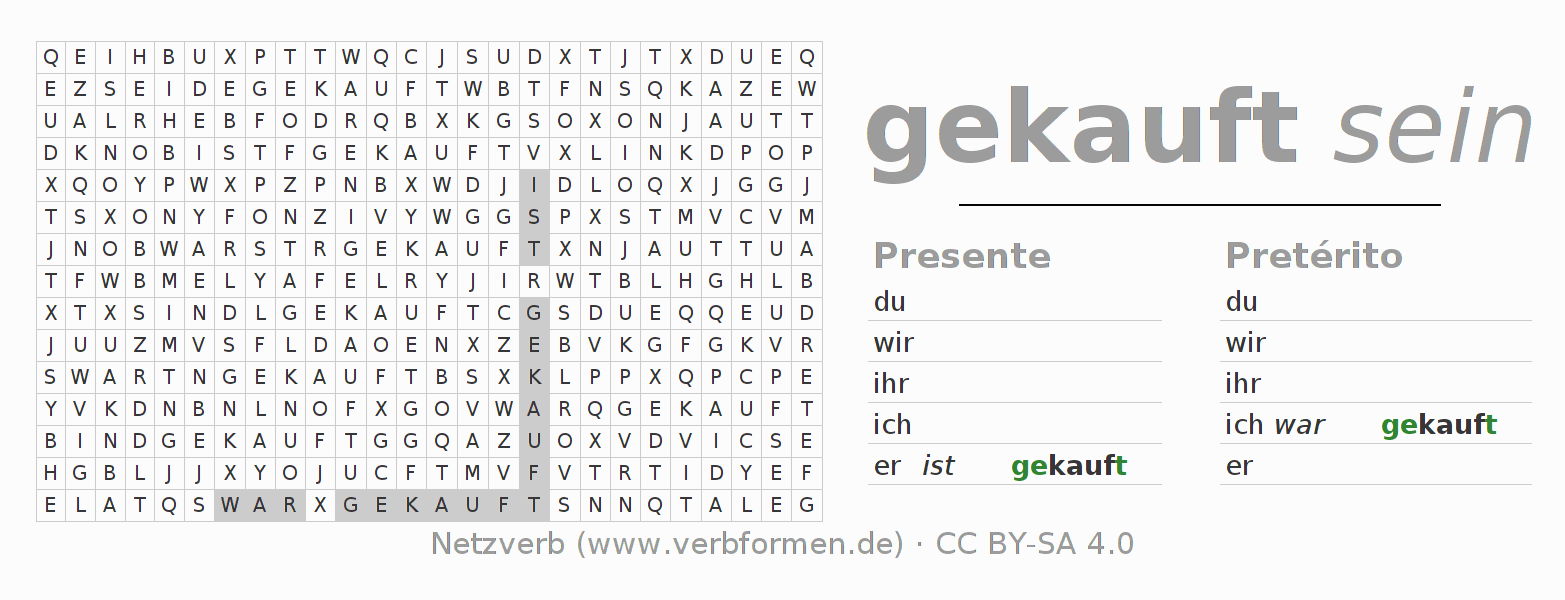 Las hojas de trabajo te ayudan para practicar con la conjugación de los verbos kaufen en la escuela o de forma autodidacta. El material de estudio es Open Educational Resources (OER), es decir, libre de licencias CC BY-SA 4.0 y pude ser descargado y utilizado de forma gratuita, por ejemplo para la escuela. Con este fin tenemos para ti varios tipos de hojas de trabajo para los verbos kaufen en forma de tablas de conjugación, acertijos y juegos. Todo el material esta disponible de forma gratuita para descargas PDF, imágenes y paginas web interactivas. Junto con los ejercicios hay innumerables ejemplos kaufen que te ayudan en el uso de los verbos.