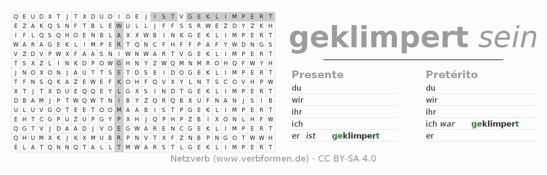 Las hojas de trabajo te ayudan para practicar con la conjugación de los verbos klimpern en la escuela o de forma autodidacta. El material de estudio es Open Educational Resources (OER), es decir, libre de licencias CC BY-SA 4.0 y pude ser descargado y utilizado de forma gratuita, por ejemplo para la escuela. Con este fin tenemos para ti varios tipos de hojas de trabajo para los verbos klimpern en forma de tablas de conjugación, acertijos y juegos. Todo el material esta disponible de forma gratuita para descargas PDF, imágenes y paginas web interactivas. Junto con los ejercicios hay innumerables ejemplos klimpern que te ayudan en el uso de los verbos.