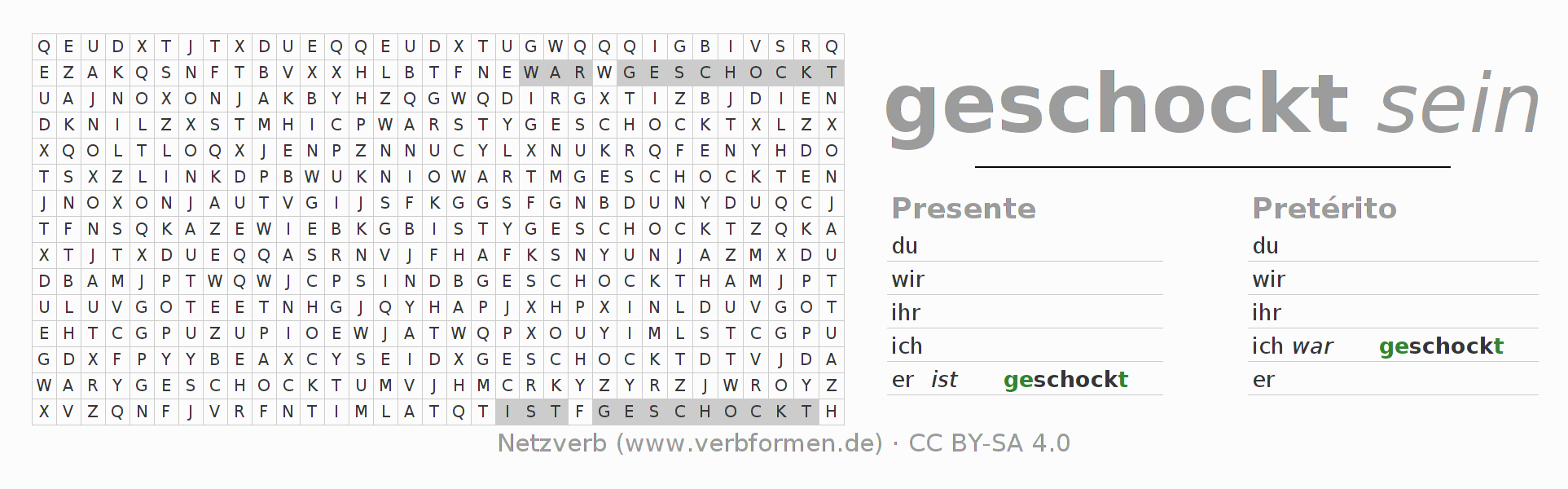 Las hojas de trabajo te ayudan para practicar con la conjugación de los verbos schocken en la escuela o de forma autodidacta. El material de estudio es Open Educational Resources (OER), es decir, libre de licencias CC BY-SA 4.0 y pude ser descargado y utilizado de forma gratuita, por ejemplo para la escuela. Con este fin tenemos para ti varios tipos de hojas de trabajo para los verbos schocken en forma de tablas de conjugación, acertijos y juegos. Todo el material esta disponible de forma gratuita para descargas PDF, imágenes y paginas web interactivas. Junto con los ejercicios hay innumerables ejemplos schocken que te ayudan en el uso de los verbos.