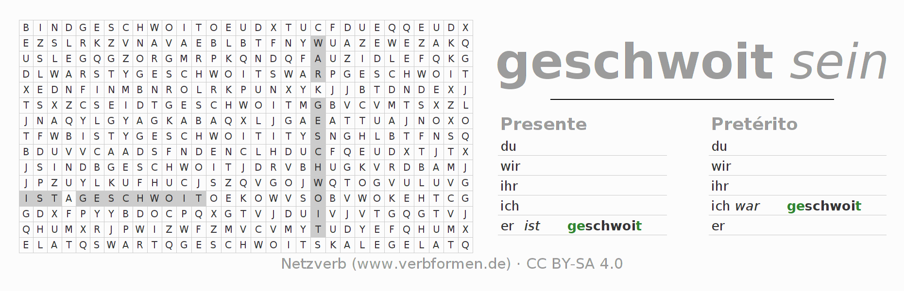 Las hojas de trabajo te ayudan para practicar con la conjugación de los verbos schwoien en la escuela o de forma autodidacta. El material de estudio es Open Educational Resources (OER), es decir, libre de licencias CC BY-SA 4.0 y pude ser descargado y utilizado de forma gratuita, por ejemplo para la escuela. Con este fin tenemos para ti varios tipos de hojas de trabajo para los verbos schwoien en forma de tablas de conjugación, acertijos y juegos. Todo el material esta disponible de forma gratuita para descargas PDF, imágenes y paginas web interactivas. Junto con los ejercicios hay innumerables ejemplos schwoien que te ayudan en el uso de los verbos.