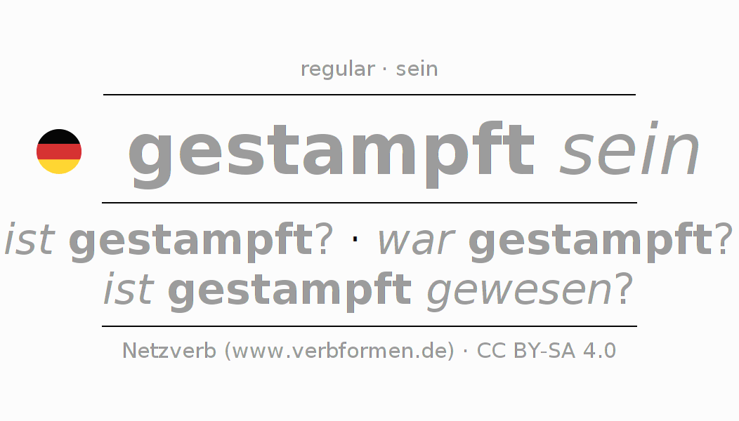 Las hojas de trabajo te ayudan para practicar con la conjugación de los verbos stampfen en la escuela o de forma autodidacta. El material de estudio es Open Educational Resources (OER), es decir, libre de licencias CC BY-SA 4.0 y pude ser descargado y utilizado de forma gratuita, por ejemplo para la escuela. Con este fin tenemos para ti varios tipos de hojas de trabajo para los verbos stampfen (ist) en forma de tablas de conjugación, acertijos y juegos. Todo el material esta disponible de forma gratuita para descargas PDF, imágenes y paginas web interactivas. Junto con los ejercicios hay innumerables ejemplos stampfen que te ayudan en el uso de los verbos.