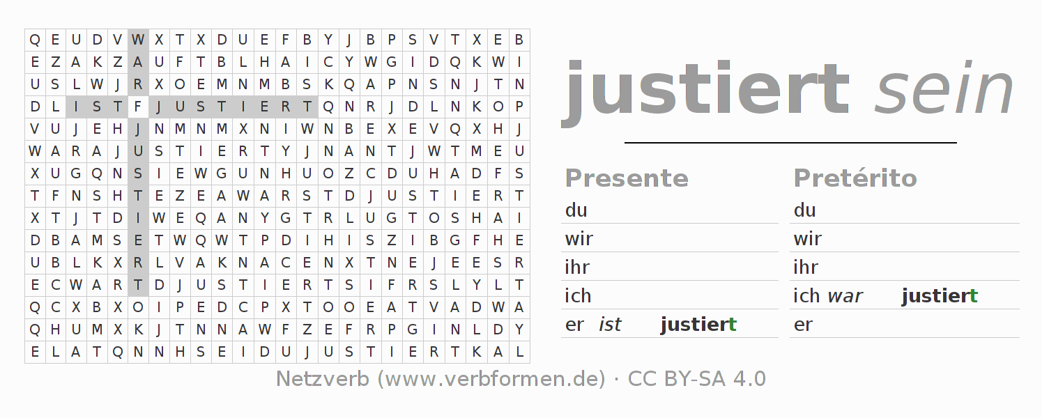 Las hojas de trabajo te ayudan para practicar con la conjugación de los verbos justieren en la escuela o de forma autodidacta. El material de estudio es Open Educational Resources (OER), es decir, libre de licencias CC BY-SA 4.0 y pude ser descargado y utilizado de forma gratuita, por ejemplo para la escuela. Con este fin tenemos para ti varios tipos de hojas de trabajo para los verbos justieren en forma de tablas de conjugación, acertijos y juegos. Todo el material esta disponible de forma gratuita para descargas PDF, imágenes y paginas web interactivas. Junto con los ejercicios hay innumerables ejemplos justieren que te ayudan en el uso de los verbos.