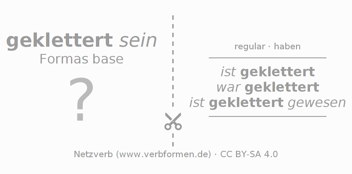 Las hojas de trabajo te ayudan para practicar con la conjugación de los verbos klettern en la escuela o de forma autodidacta. El material de estudio es Open Educational Resources (OER), es decir, libre de licencias CC BY-SA 4.0 y pude ser descargado y utilizado de forma gratuita, por ejemplo para la escuela. Con este fin tenemos para ti varios tipos de hojas de trabajo para los verbos klettern (hat) en forma de tablas de conjugación, acertijos y juegos. Todo el material esta disponible de forma gratuita para descargas PDF, imágenes y paginas web interactivas. Junto con los ejercicios hay innumerables ejemplos klettern que te ayudan en el uso de los verbos.