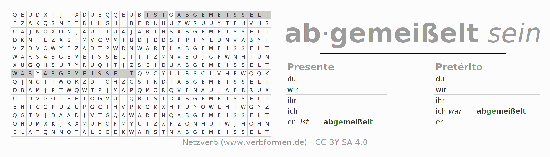 Las hojas de trabajo te ayudan para practicar con la conjugación de los verbos abmeißeln en la escuela o de forma autodidacta. El material de estudio es Open Educational Resources (OER), es decir, libre de licencias CC BY-SA 4.0 y pude ser descargado y utilizado de forma gratuita, por ejemplo para la escuela. Con este fin tenemos para ti varios tipos de hojas de trabajo para los verbos abmeißeln en forma de tablas de conjugación, acertijos y juegos. Todo el material esta disponible de forma gratuita para descargas PDF, imágenes y paginas web interactivas. Junto con los ejercicios hay innumerables ejemplos abmeißeln que te ayudan en el uso de los verbos.