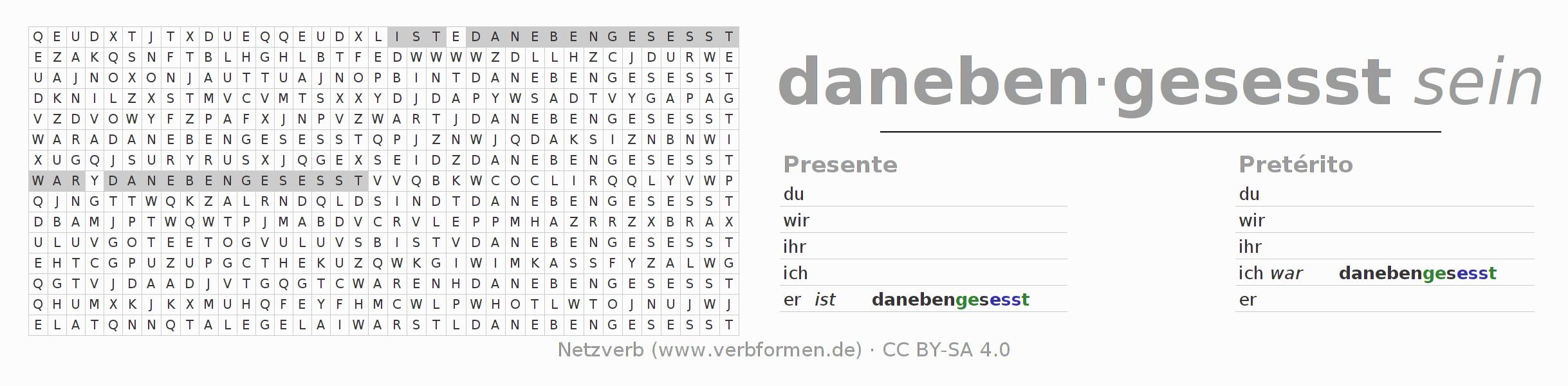 Las hojas de trabajo te ayudan para practicar con la conjugación de los verbos danebensitzen en la escuela o de forma autodidacta. El material de estudio es Open Educational Resources (OER), es decir, libre de licencias CC BY-SA 4.0 y pude ser descargado y utilizado de forma gratuita, por ejemplo para la escuela. Con este fin tenemos para ti varios tipos de hojas de trabajo para los verbos danebensitzen en forma de tablas de conjugación, acertijos y juegos. Todo el material esta disponible de forma gratuita para descargas PDF, imágenes y paginas web interactivas. Junto con los ejercicios hay innumerables ejemplos danebensitzen que te ayudan en el uso de los verbos.