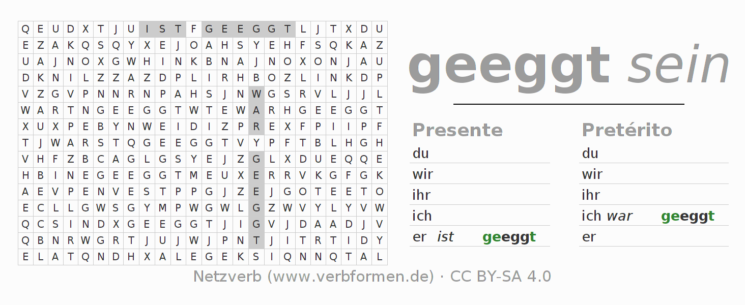 Las hojas de trabajo te ayudan para practicar con la conjugación de los verbos eggen en la escuela o de forma autodidacta. El material de estudio es Open Educational Resources (OER), es decir, libre de licencias CC BY-SA 4.0 y pude ser descargado y utilizado de forma gratuita, por ejemplo para la escuela. Con este fin tenemos para ti varios tipos de hojas de trabajo para los verbos eggen en forma de tablas de conjugación, acertijos y juegos. Todo el material esta disponible de forma gratuita para descargas PDF, imágenes y paginas web interactivas. Junto con los ejercicios hay innumerables ejemplos eggen que te ayudan en el uso de los verbos.