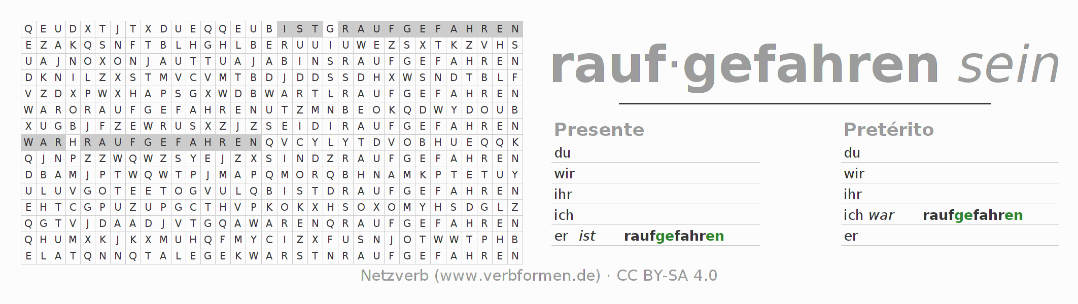 Las hojas de trabajo te ayudan para practicar con la conjugación de los verbos rauffahren en la escuela o de forma autodidacta. El material de estudio es Open Educational Resources (OER), es decir, libre de licencias CC BY-SA 4.0 y pude ser descargado y utilizado de forma gratuita, por ejemplo para la escuela. Con este fin tenemos para ti varios tipos de hojas de trabajo para los verbos rauffahren en forma de tablas de conjugación, acertijos y juegos. Todo el material esta disponible de forma gratuita para descargas PDF, imágenes y paginas web interactivas. Junto con los ejercicios hay innumerables ejemplos rauffahren que te ayudan en el uso de los verbos.