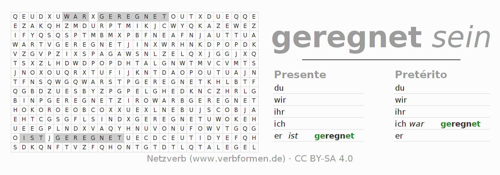 Las hojas de trabajo te ayudan para practicar con la conjugación de los verbos regnen en la escuela o de forma autodidacta. El material de estudio es Open Educational Resources (OER), es decir, libre de licencias CC BY-SA 4.0 y pude ser descargado y utilizado de forma gratuita, por ejemplo para la escuela. Con este fin tenemos para ti varios tipos de hojas de trabajo para los verbos regnen (hat) en forma de tablas de conjugación, acertijos y juegos. Todo el material esta disponible de forma gratuita para descargas PDF, imágenes y paginas web interactivas. Junto con los ejercicios hay innumerables ejemplos regnen que te ayudan en el uso de los verbos.