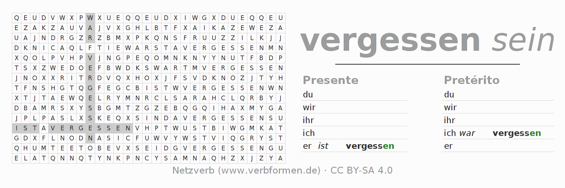 Las hojas de trabajo te ayudan para practicar con la conjugación de los verbos vergessen en la escuela o de forma autodidacta. El material de estudio es Open Educational Resources (OER), es decir, libre de licencias CC BY-SA 4.0 y pude ser descargado y utilizado de forma gratuita, por ejemplo para la escuela. Con este fin tenemos para ti varios tipos de hojas de trabajo para los verbos vergessen en forma de tablas de conjugación, acertijos y juegos. Todo el material esta disponible de forma gratuita para descargas PDF, imágenes y paginas web interactivas. Junto con los ejercicios hay innumerables ejemplos vergessen que te ayudan en el uso de los verbos.