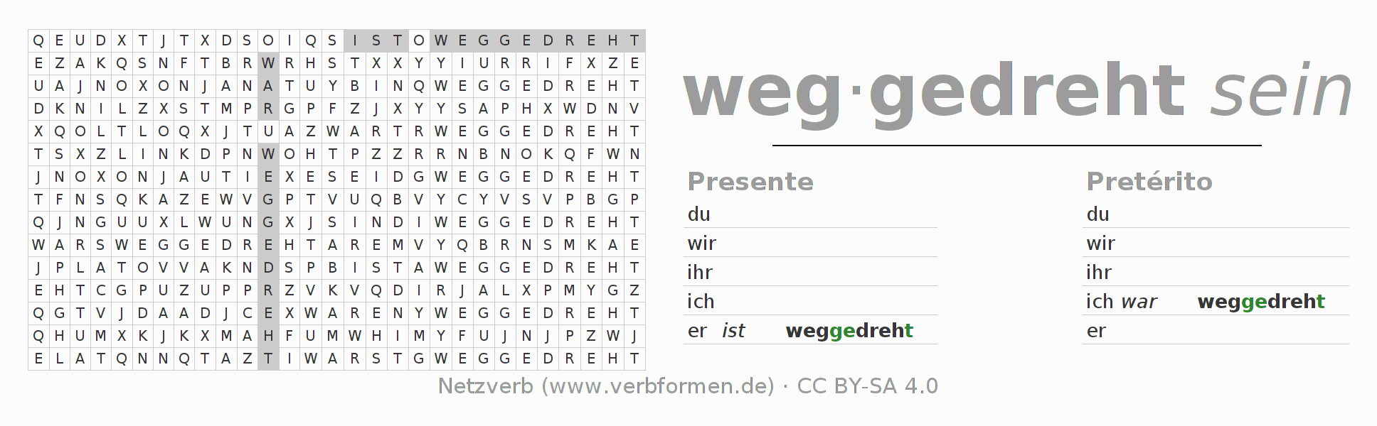 Las hojas de trabajo te ayudan para practicar con la conjugación de los verbos wegdrehen en la escuela o de forma autodidacta. El material de estudio es Open Educational Resources (OER), es decir, libre de licencias CC BY-SA 4.0 y pude ser descargado y utilizado de forma gratuita, por ejemplo para la escuela. Con este fin tenemos para ti varios tipos de hojas de trabajo para los verbos wegdrehen en forma de tablas de conjugación, acertijos y juegos. Todo el material esta disponible de forma gratuita para descargas PDF, imágenes y paginas web interactivas. Junto con los ejercicios hay innumerables ejemplos wegdrehen que te ayudan en el uso de los verbos.
