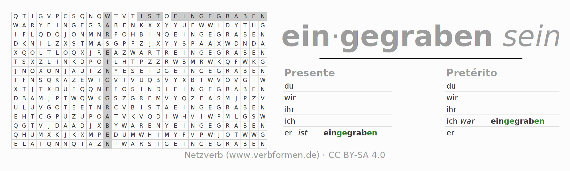 Las hojas de trabajo te ayudan para practicar con la conjugación de los verbos eingraben en la escuela o de forma autodidacta. El material de estudio es Open Educational Resources (OER), es decir, libre de licencias CC BY-SA 4.0 y pude ser descargado y utilizado de forma gratuita, por ejemplo para la escuela. Con este fin tenemos para ti varios tipos de hojas de trabajo para los verbos sich eingraben en forma de tablas de conjugación, acertijos y juegos. Todo el material esta disponible de forma gratuita para descargas PDF, imágenes y paginas web interactivas. Junto con los ejercicios hay innumerables ejemplos eingraben que te ayudan en el uso de los verbos.