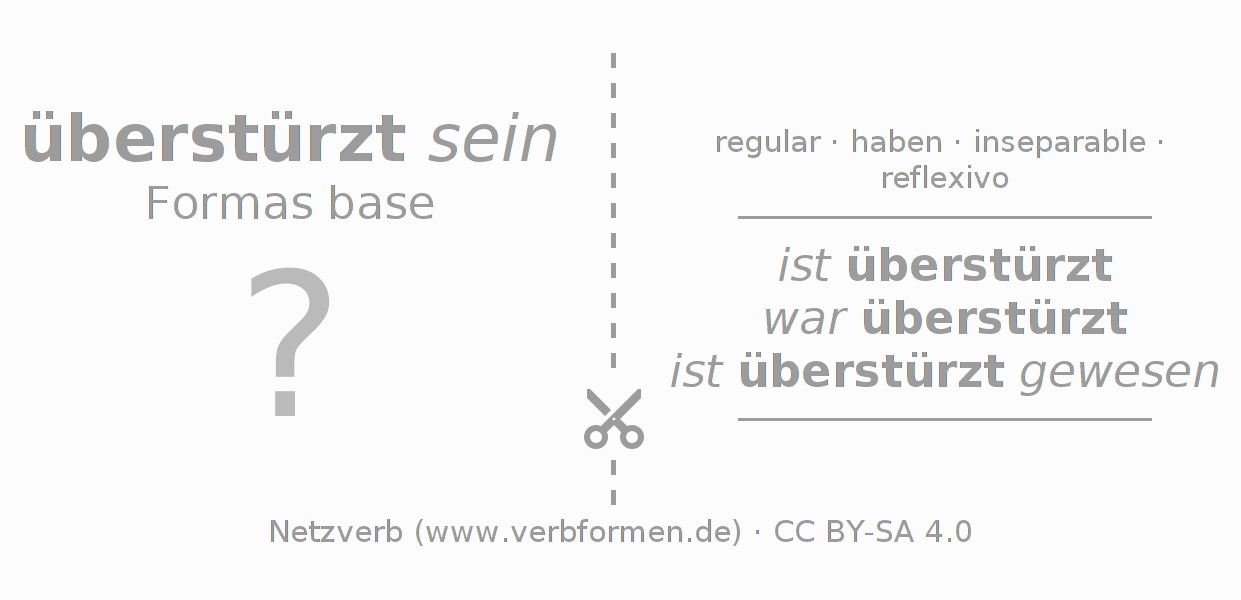 Las hojas de trabajo te ayudan para practicar con la conjugación de los verbos überstürzen en la escuela o de forma autodidacta. El material de estudio es Open Educational Resources (OER), es decir, libre de licencias CC BY-SA 4.0 y pude ser descargado y utilizado de forma gratuita, por ejemplo para la escuela. Con este fin tenemos para ti varios tipos de hojas de trabajo para los verbos sich überstürzen en forma de tablas de conjugación, acertijos y juegos. Todo el material esta disponible de forma gratuita para descargas PDF, imágenes y paginas web interactivas. Junto con los ejercicios hay innumerables ejemplos überstürzen que te ayudan en el uso de los verbos.