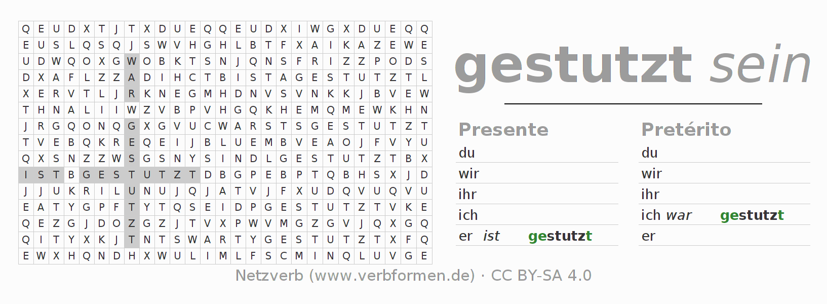 Las hojas de trabajo te ayudan para practicar con la conjugación de los verbos stutzen en la escuela o de forma autodidacta. El material de estudio es Open Educational Resources (OER), es decir, libre de licencias CC BY-SA 4.0 y pude ser descargado y utilizado de forma gratuita, por ejemplo para la escuela. Con este fin tenemos para ti varios tipos de hojas de trabajo para los verbos stutzen en forma de tablas de conjugación, acertijos y juegos. Todo el material esta disponible de forma gratuita para descargas PDF, imágenes y paginas web interactivas. Junto con los ejercicios hay innumerables ejemplos stutzen que te ayudan en el uso de los verbos.