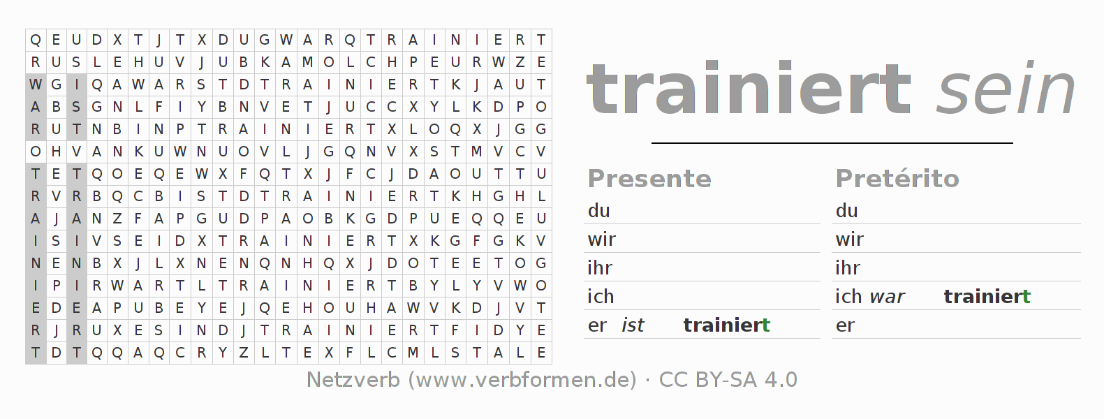 Las hojas de trabajo te ayudan para practicar con la conjugación de los verbos trainieren en la escuela o de forma autodidacta. El material de estudio es Open Educational Resources (OER), es decir, libre de licencias CC BY-SA 4.0 y pude ser descargado y utilizado de forma gratuita, por ejemplo para la escuela. Con este fin tenemos para ti varios tipos de hojas de trabajo para los verbos trainieren en forma de tablas de conjugación, acertijos y juegos. Todo el material esta disponible de forma gratuita para descargas PDF, imágenes y paginas web interactivas. Junto con los ejercicios hay innumerables ejemplos trainieren que te ayudan en el uso de los verbos.