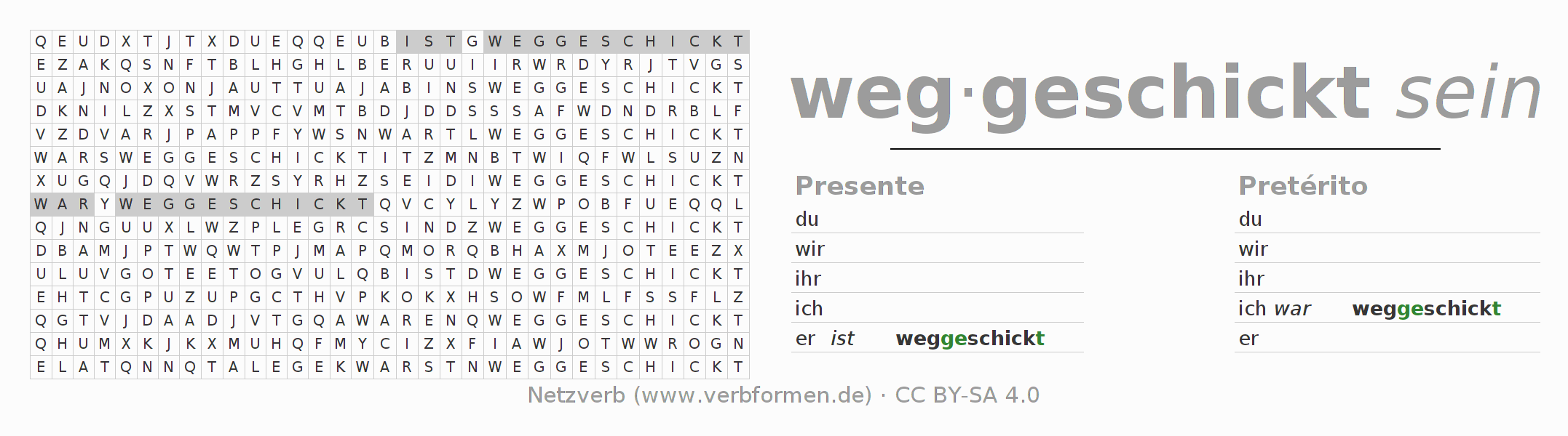 Las hojas de trabajo te ayudan para practicar con la conjugación de los verbos wegschicken en la escuela o de forma autodidacta. El material de estudio es Open Educational Resources (OER), es decir, libre de licencias CC BY-SA 4.0 y pude ser descargado y utilizado de forma gratuita, por ejemplo para la escuela. Con este fin tenemos para ti varios tipos de hojas de trabajo para los verbos wegschicken en forma de tablas de conjugación, acertijos y juegos. Todo el material esta disponible de forma gratuita para descargas PDF, imágenes y paginas web interactivas. Junto con los ejercicios hay innumerables ejemplos wegschicken que te ayudan en el uso de los verbos.