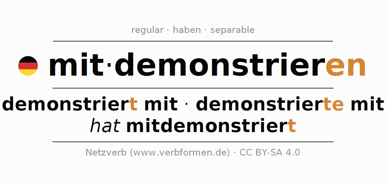 - Pasado perfecto: ich habe mitdemonstriert, du hast mitdemonstriert, er hat mitdemonstriert, wir haben mitdemonstriert, ihr habt mitdemonstriert, sie haben mitdemonstriert