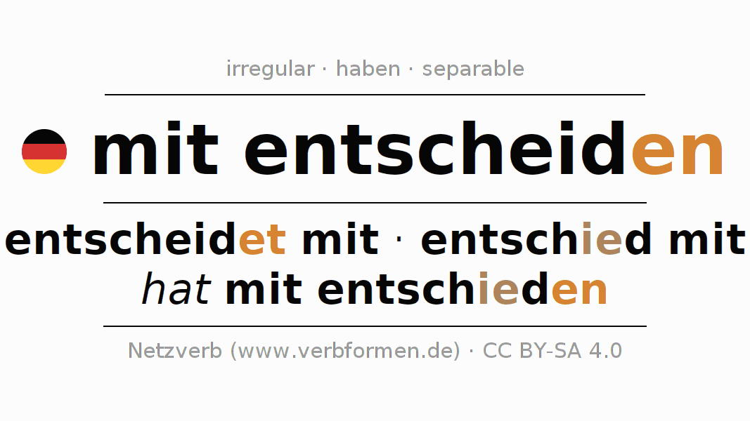 - Pretérito: ich entschied mit, du entschied(e)st mit, er entschied mit, wir entschieden mit, ihr entschiedet mit, sie entschieden mit