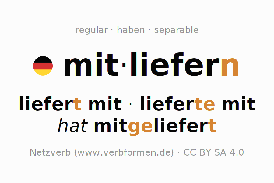 - Pasado perfecto: ich habe mitgeliefert, du hast mitgeliefert, er hat mitgeliefert, wir haben mitgeliefert, ihr habt mitgeliefert, sie haben mitgeliefert