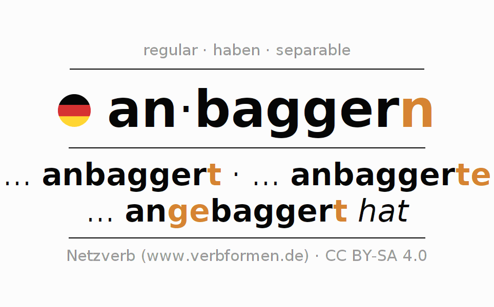 Tablas de verbos para la conjugación de an·baggern en línea, representadas de forma simple, con todas las construcciones verbales en singular y plural, en todas las personas gramaticales (1ª persona, 2ª persona, 3ª persona). El practicar la conjugación del verbo an·baggern es útil para tareas, exámenes, la escuela, la universidad, las clases de alemán y para los estudiantes adultos. Especialmente para los estudiantes del alemán es muy importante el conjugar los verbos y el formar las raíces verbales de forma correcta. Aquí encuentras más información acerca del tema Wiktionary anbaggern und unter anbaggern im Duden.
