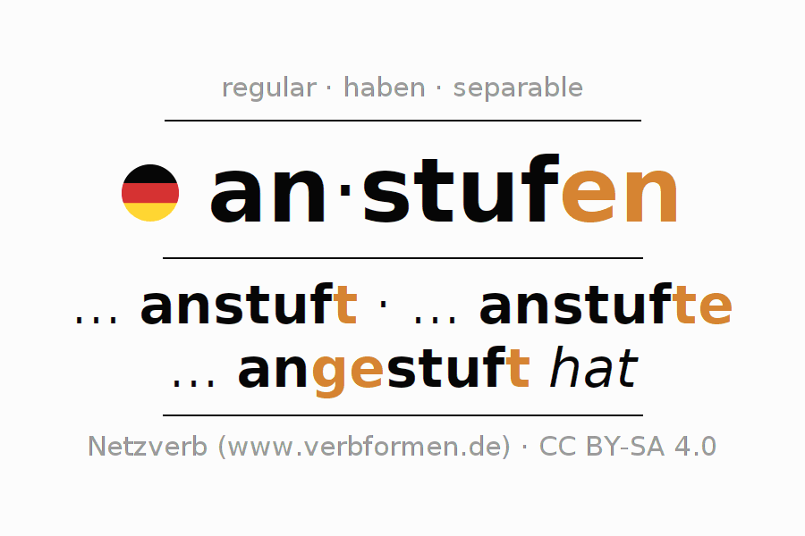 - Presente: stuf(e) (du) an, stufen wir an, stuft (ihr) an, stufen Sie an