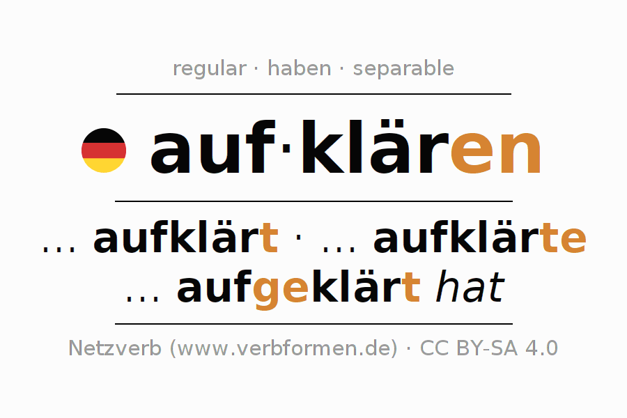 Tablas de verbos para la conjugación de auf·klären en línea, representadas de forma simple, con todas las construcciones verbales en singular y plural, en todas las personas gramaticales (1ª persona, 2ª persona, 3ª persona). El practicar la conjugación del verbo auf·klären es útil para tareas, exámenes, la escuela, la universidad, las clases de alemán y para los estudiantes adultos. Especialmente para los estudiantes del alemán es muy importante el conjugar los verbos y el formar las raíces verbales de forma correcta. Aquí encuentras más información acerca del tema Wiktionary aufklären und unter aufklären im Duden.