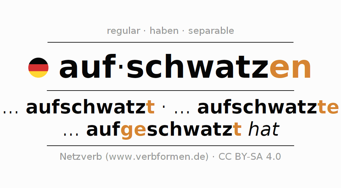 - Presente: schwatz(e) (du) auf, schwatzen wir auf, schwatzt (ihr) auf, schwatzen Sie auf