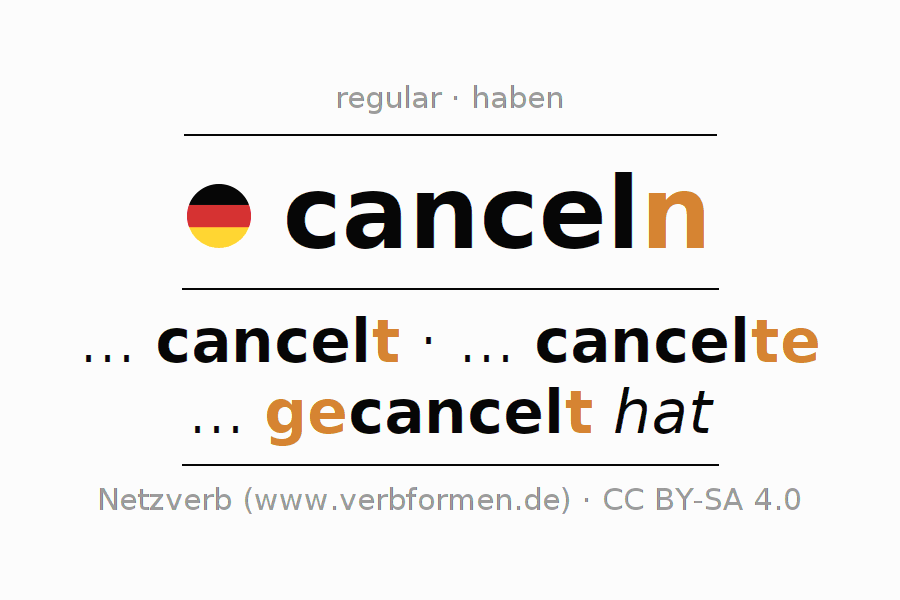- Futuro II: ... ich gecancelt haben werde, ... du gecancelt haben wirst, ... er gecancelt haben wird, ... wir gecancelt haben werden, ... ihr gecancelt haben werdet, ... sie gecancelt haben werden