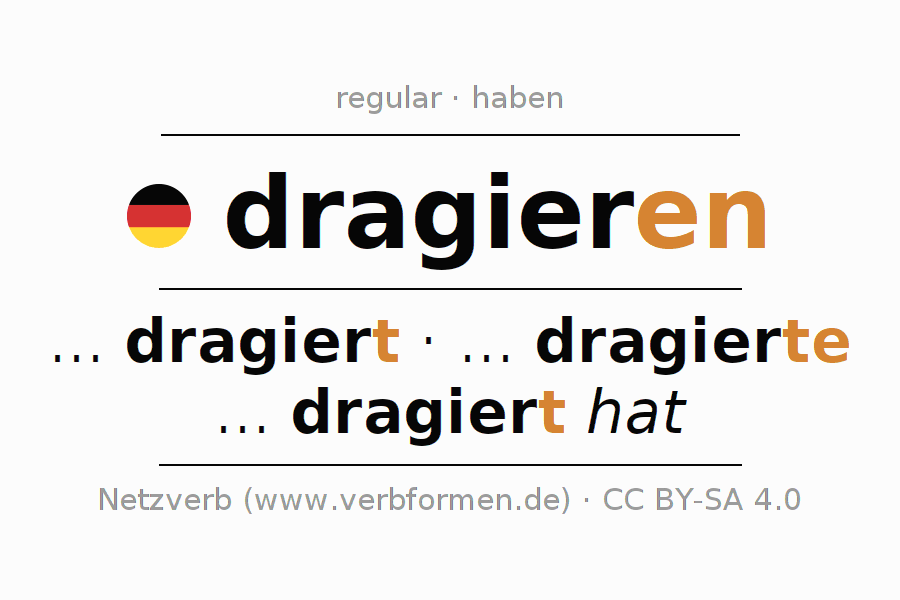 Tablas de verbos para la conjugación de dragieren en línea, representadas de forma simple, con todas las construcciones verbales en singular y plural, en todas las personas gramaticales (1ª persona, 2ª persona, 3ª persona). El practicar la conjugación del verbo dragieren es útil para tareas, exámenes, la escuela, la universidad, las clases de alemán y para los estudiantes adultos. Especialmente para los estudiantes del alemán es muy importante el conjugar los verbos y el formar las raíces verbales de forma correcta. Aquí encuentras más información acerca del tema Wiktionary dragieren und unter dragieren im Duden.