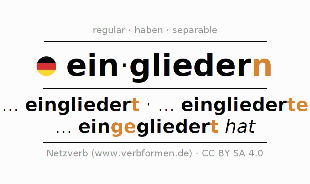 - Pasado perfecto: ... ich eingegliedert habe, ... du eingegliedert hast, ... er eingegliedert hat, ... wir eingegliedert haben, ... ihr eingegliedert habt, ... sie eingegliedert haben