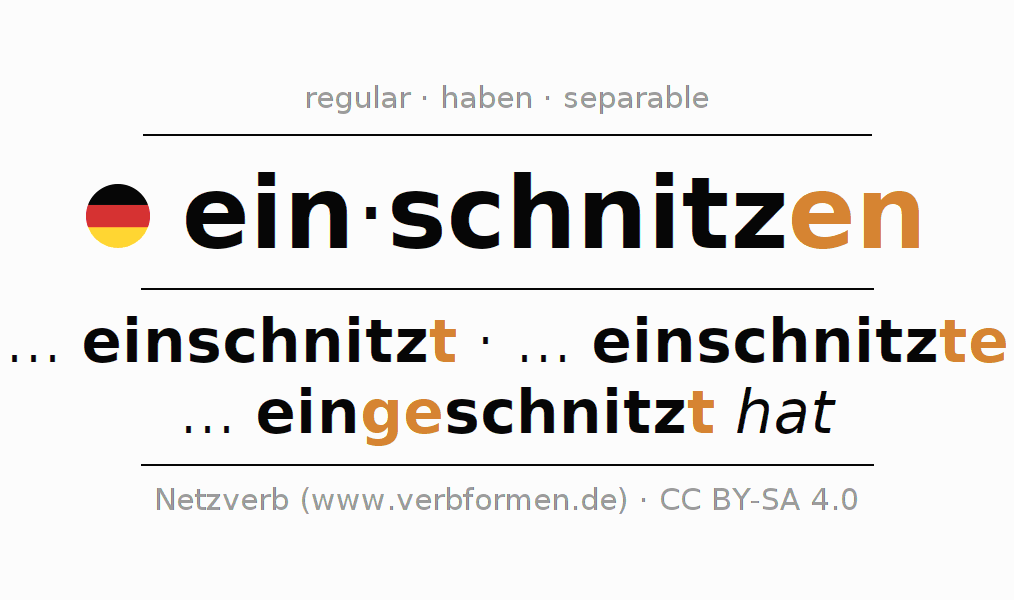 - Presente: schnitz(e) (du) ein, schnitzen wir ein, schnitzt (ihr) ein, schnitzen Sie ein