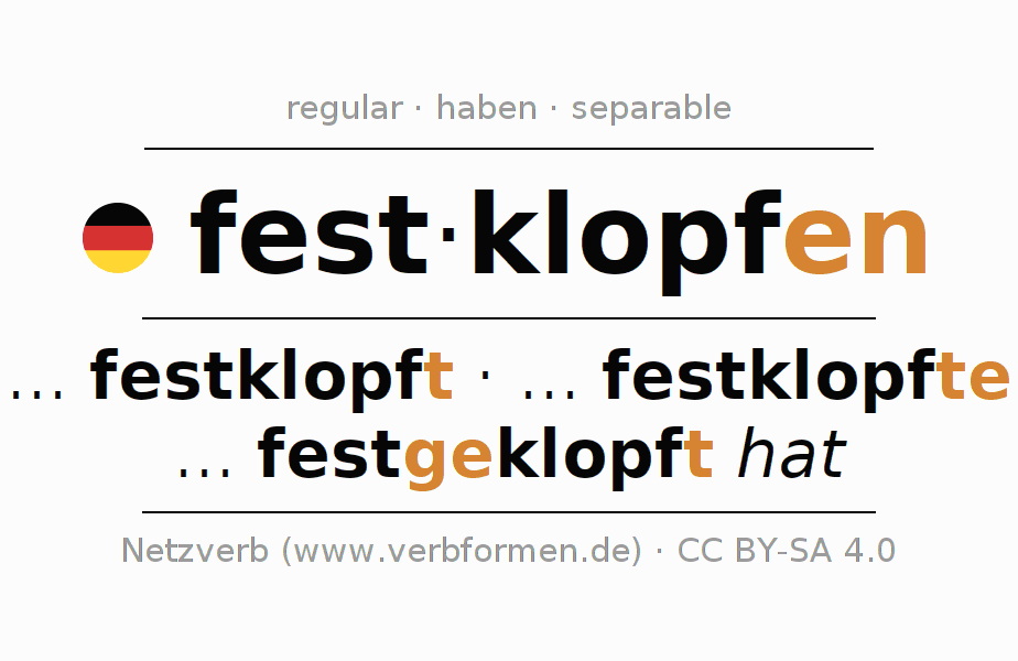 - Pasado perfecto: ... ich festgeklopft habe, ... du festgeklopft hast, ... er festgeklopft hat, ... wir festgeklopft haben, ... ihr festgeklopft habt, ... sie festgeklopft haben