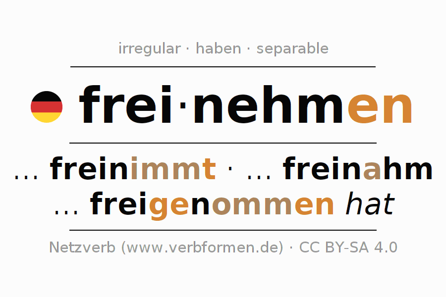 - Futuro I: ... ich freinehmen werde, ... du freinehmen wirst, ... er freinehmen wird, ... wir freinehmen werden, ... ihr freinehmen werdet, ... sie freinehmen werden