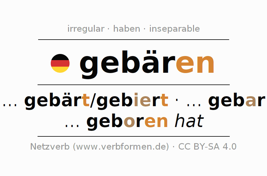 Tablas de verbos para la conjugación de gebären en línea, representadas de forma simple, con todas las construcciones verbales en singular y plural, en todas las personas gramaticales (1ª persona, 2ª persona, 3ª persona). El practicar la conjugación del verbo gebären es útil para tareas, exámenes, la escuela, la universidad, las clases de alemán y para los estudiantes adultos. Especialmente para los estudiantes del alemán es muy importante el conjugar los verbos y el formar las raíces verbales de forma correcta. Aquí encuentras más información acerca del tema Wiktionary gebären und unter gebären im Duden.