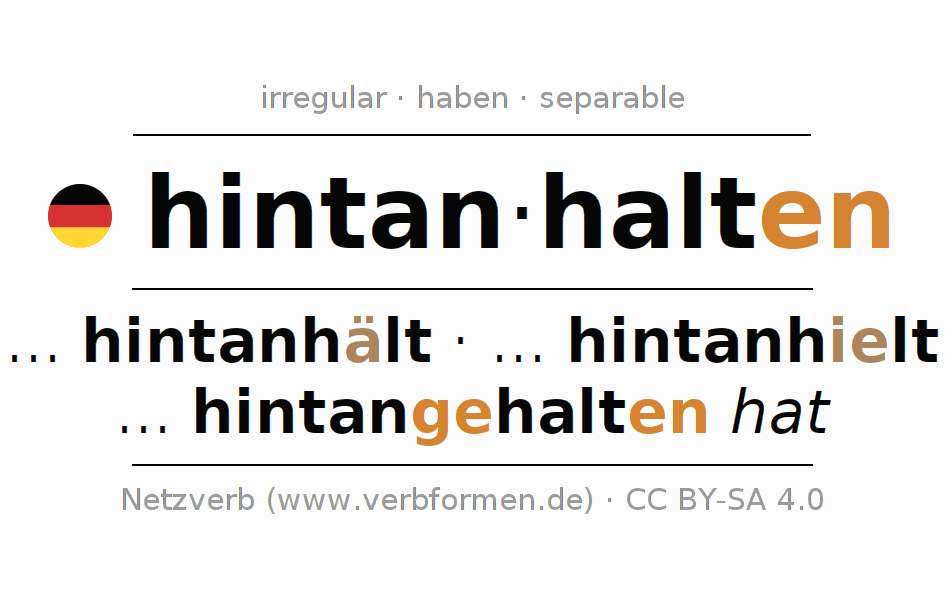 - Presente: halt(e) (du) hintan, halten wir hintan, haltet (ihr) hintan, halten Sie hintan