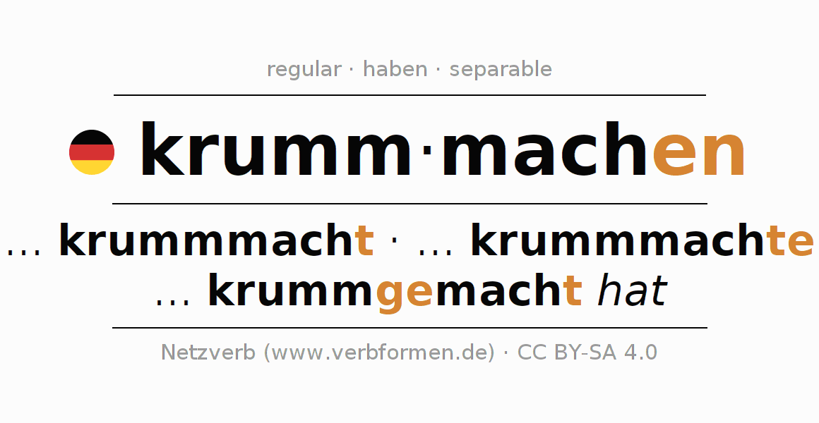- Presente: ... ich krummmach(e), ... du krummmachst, ... er krummmacht, ... wir krummmachen, ... ihr krummmacht, ... sie krummmachen