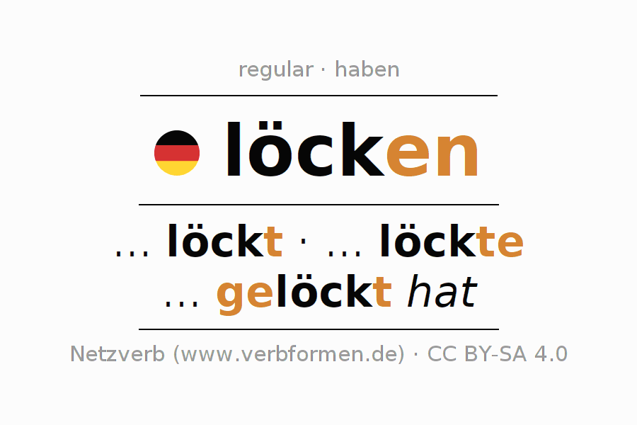 Tablas de verbos para la conjugación de löcken en línea, representadas de forma simple, con todas las construcciones verbales en singular y plural, en todas las personas gramaticales (1ª persona, 2ª persona, 3ª persona). El practicar la conjugación del verbo löcken es útil para tareas, exámenes, la escuela, la universidad, las clases de alemán y para los estudiantes adultos. Especialmente para los estudiantes del alemán es muy importante el conjugar los verbos y el formar las raíces verbales de forma correcta. Aquí encuentras más información acerca del tema Wiktionary löcken und unter löcken im Duden.