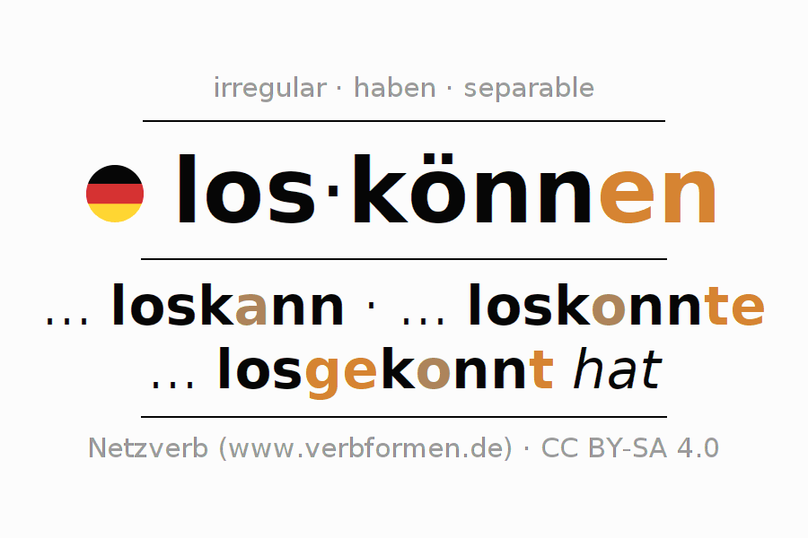 Tablas de verbos para la conjugación de los·können en línea, representadas de forma simple, con todas las construcciones verbales en singular y plural, en todas las personas gramaticales (1ª persona, 2ª persona, 3ª persona). El practicar la conjugación del verbo los·können es útil para tareas, exámenes, la escuela, la universidad, las clases de alemán y para los estudiantes adultos. Especialmente para los estudiantes del alemán es muy importante el conjugar los verbos y el formar las raíces verbales de forma correcta. Aquí encuentras más información acerca del tema Wiktionary loskönnen und unter loskönnen im Duden.