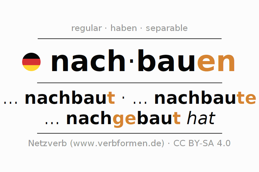 - Presente: ... ich nachbau(e), ... du nachbaust, ... er nachbaut, ... wir nachbau(e)n, ... ihr nachbaut, ... sie nachbau(e)n
